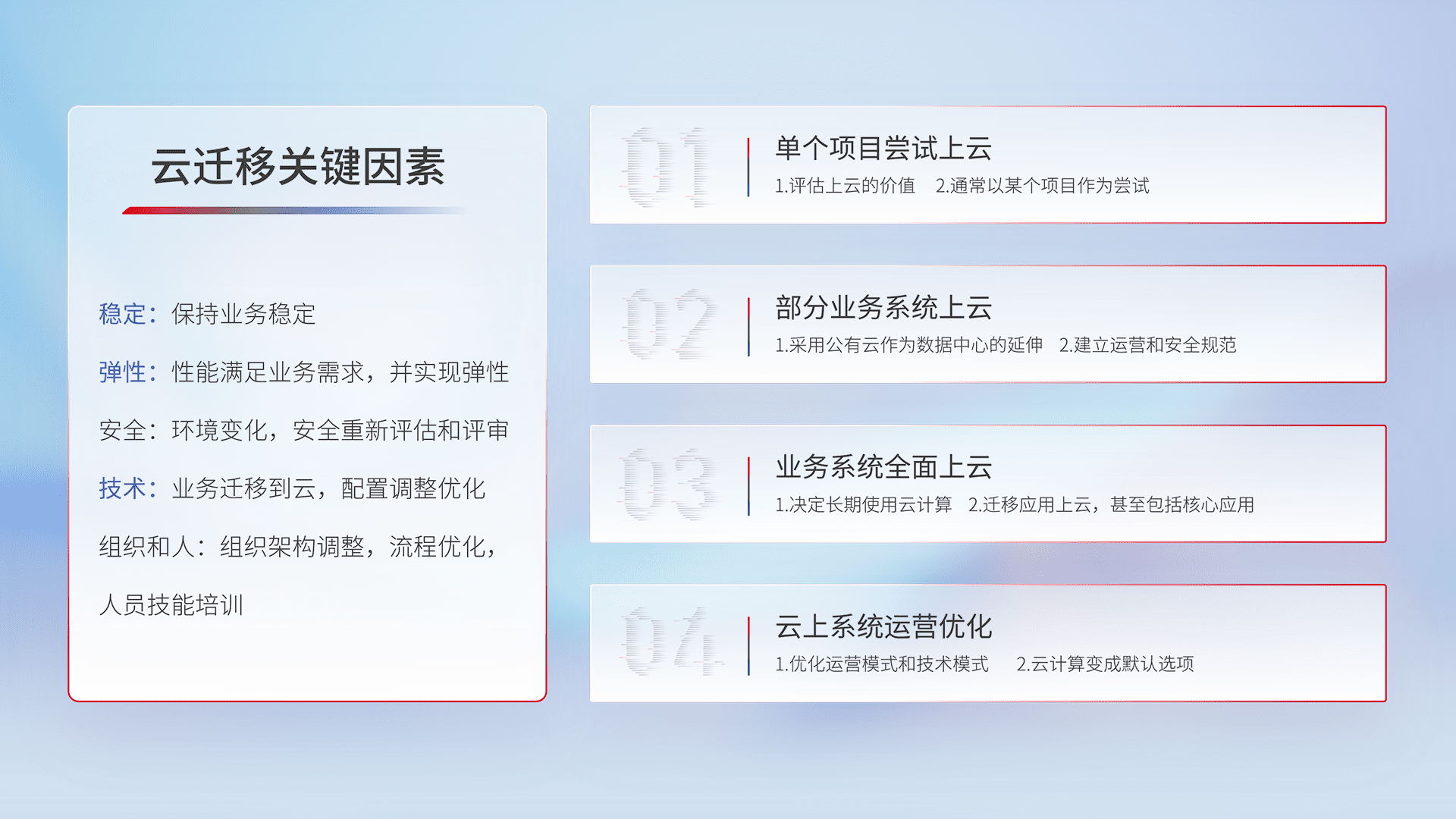 结合实际业务,,,从规划设计、、、云平台选型、、云原生改造、、数据迁移、、集成交付,,,迁移全过程为客户识别最佳上云路径,,做好风险识别管理,,,,设计网络架构、、、身份权限、、安全审计合规、、操作审计、、、日志审计、、、监控告警策略、、多站点容灾设计等,,对云上基础设施进行整体规划,,,,提升IT治理水平,,,,以满足弹性、、、高可用、、、高性能的需求。。。