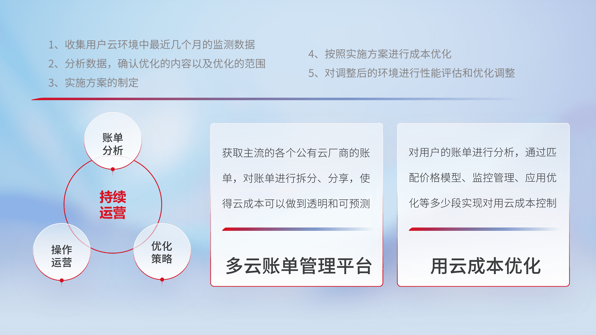 通过多云纳管,,,以统一的资源数据模型把客户的云资源进行抽象和封装,,,,进而实现对多云资源的统一操作,,保障云资源管理的可靠性、、稳定性与可用性。。。量身定制化运维内容,,,配置、、开发运维、、、补丁管理、、、、备份、、、、监控、、、、认证和访问管理、、审计和日常巡检等,,保障在用云过程中的可靠度,,,稳定度以及高可用率。。。。